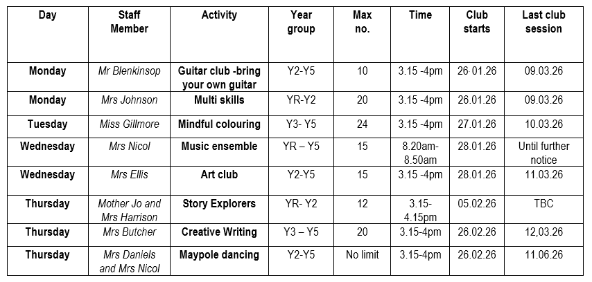 This term we will be running the following clubs as well as a Rockstars choir led by Billie and a Drama club with Charmaine, taking place on a Tuesday and a Thursday :